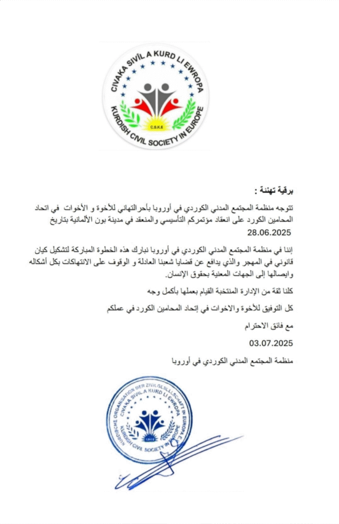 رقية تهنئة من منظمة المجتمع المدني في اوربا بمناسبة انعقاد المؤتمر التأسيسي لإتحاد المحامين الكورد.