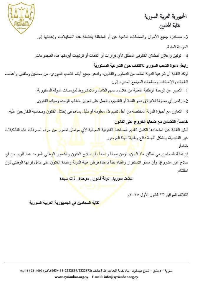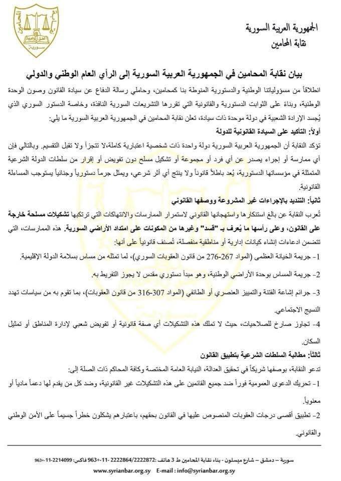 وانطلاقاً من هذه المبادئ، فإن ما تضمّنه البيانان من خطابٍ تعبويٍّ وتحريضيٍّ، ولغةٍ انفعالية تُصدر أحكاماً مسبقة، وتوصيفات تجريمية عامة تفتقر إلى الدقة القانونية، يُشكّل خروجاً صريحاً عن رسالة المحاماة وإطارها القانوني والحقوقي. كما ينطوي ذلك على تبنّي إدانةٍ مسبقة دون صدور أحكام قضائية، في مخالفةٍ واضحة لمبدأ قرينة البراءة وضمانات المحاكمة العادلة، وانحيازٍ سياسيٍّ وأمنيٍّ أفقد النقابة موقعها كجهةٍ مهنيةٍ مستقلة، فضلاً عن الدعوة إلى الملاحقة وإنزال أقصى العقوبات خارج نطاق اختصاص النقابات وصلاحياتها، مع تغييب الدعوة إلى تحقيقٍ مستقل أو مساءلةٍ قانونية نزيهة، وغياب الإشارة إلى حماية المدنيين واحترام القانون الدولي الإنساني، وما يرافق ذلك من تعميماتٍ تُؤجّج الانقسام المجتمعي وتهدّد السلم الأهلي، بما في ذلك التحريض غير المباشر ضد الشعب الكوردي.