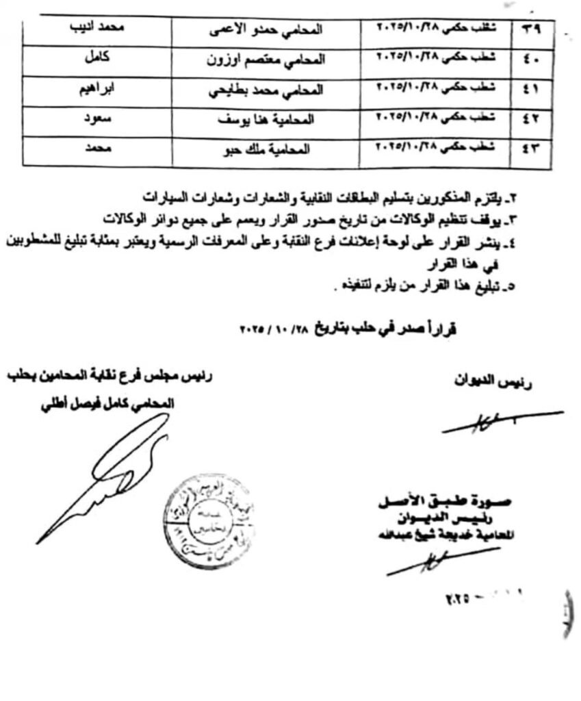 كما صدر عن مجلس فرع نقابة المحامين بحلب القرار رقم (2335) بتاريخ 28 تشرين الأول 2025، القاضي بشطب 43 محامياً حكماً من الجدول. وقد صدر قرار الشطب الحكمي بصفة إدارية ولائية لا قضائية تأديبية، ما يجعله معجّل النفاذ، كما أن الطعن فيه أمام مجلس النقابة لا يوقف التنفيذ.
